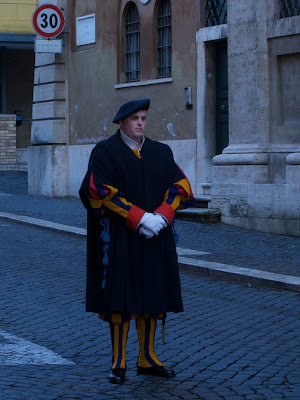 January 31, 2010 (Dieter). We made it! Took turns sleeping and watching our back packs, nibbling, running to the WCs, and getting our boarding cards printed at 0330. Checked into the security at 0430 and onto the tarmac and in the air by 0610. No sooner had we locked the buckles to our seatbelts and we were gone, sleeping most of the flight to Rome. Saw the Italian Alps covered in snow. Blue skies and sun shining as we landed in Rome. A wonderful taxi ride through old and new Rome to our new apartments for the next 5, oh no, I mean four more days. It is a wonderful room (thanks to Rey and Laura) overlooking Piazza Norvona. Our building dates back to the early 4th century build of post and beam (oak) structure. After meeting with the landlord, we managed to get pizza and off to get into the cue at the Vatican City for a "free" (music to my ears) tour. On the way there, we pass by a large demonstration at St. Peter's Bascilica. We had no idea what the demonstration was on, but we heard the Pope addressing the audience and large applause by the audience that had assembled in mass under umbrellas. The little Vatican country is well protected by the Swiss Royal Security in period costume (but ready to defend). We managed getting passed security and into the Vatican Museum at 1226, with the last tour closing at 1230. What an amazing experience! The Vatican Museum held artifacts dating back from the Pharonic period, through to the Etruscans (people who lived here in Rome prior to the Romans), Roman, early church artifacts, to the hundreds of painting, both hung as well as part of the ceilings, tapestries dating back to the early 2nd century, and the amazing Cistine Chapel paintings by Michelangelo - wow! And to find the one painting on the back wall with the amazing details of the Last Judgement - he even found a way to paint a person whom he disliked in an characture of evil (see the lower right corner and look at the male he painted next time you see this picture). Then to see how the paintings from the front of the Cistine Chapel were in amazing details, with every detail of human muscles to the fine details of hairs. As we looked at the ceiling toward the back, we noticed how the artwork became less detailed, with the figures being much larger. The theory is that the painter was much more meticulous in the beginning, providing the many details and as the time progressed and the lack of payment for his work became more obvious, his willingness to spend the time with the details become less as well. We watch museum attendees slowly descending down the circular stairway. Alex and Karannina enjoy a final rub of the brass hand rail as we leave the Vatican City (or is it country). One the way back, we encounter various shop keepers and kiosks trying to sell their "holy" Catholic memoriablia. We are able to walk through the piazza facing the St. Paul's Basilica, take a few memorable photos, one with Alexander demonstrating his greatness under his inscribed name. One the way home, we found a grocery store and found another way to save more money with a wonderful fixings for a supper meal of pasta, beef, and vegies for a salad and oh, did I forget the Toscana red wine. All our senses have been stretched to the limit and its time to complete this blog and crash in this most peaceful abode.